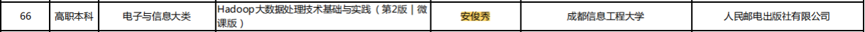 近日,教育部公示拟入选首批高职本科组“十四五”职业教育国家规划教材名单,公司数据科学与工程系安俊秀教授编写的《Hadoop大数据处理技术基础与实践(第2版|微课版)》教材由四川省教育厅推荐,入选首批“十四五”职业教育国家规划教材公示名单。