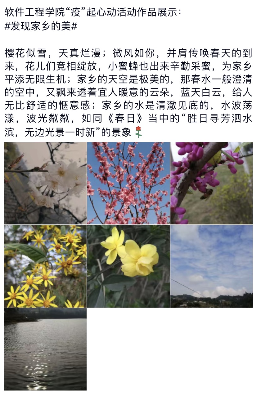 活动意在收集同学们周围的光和热,并且将其分享出来,以此来彼此传递自己身边的美好。作品通过空间说说的形式,带给同学们一种熟悉、温暖感。参与的同学们纷纷精心准备自己的作品,每一张图片,每一段话,都是给大家分享自己的生活,同时在疫情期间对彼此进行鼓励。传递爱与温暖是本次活动的目的,也希望疫情期间同学们能够收获属于自己的爱和温暖。