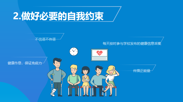 目前,疫情防控正处于关键时期,持续时间不能检测,请全体同学始终保持警惕,不能掉以轻心。根据疫情进展和学校部署做好相应防控工作。注意保持身体健康,加强室内锻炼,保持良好饮食和卫生习惯,提高自身免疫力。少去或者不去人群聚集的公共场所;必须外出时请自觉佩戴口罩并且做好回家后第一时间消毒杀菌的步骤;尽量不接待串门的亲邻好友,可改用电话,网络等方式联络感情,相信同学们在这次疫情过后,与好友的感情也会变得更加坚固。