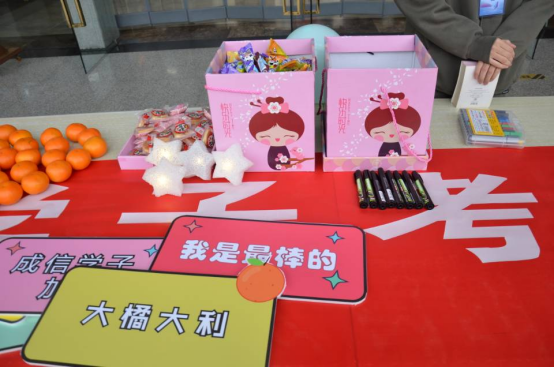 活动现场,“博雅心语”名辅导员工作室积极稳定考生心理状态,给予积极的心理暗示,小小的橘子和甜甜的糖果寓意“心想事成”和“大吉大利”,为成信学子们带来了温暖和祝愿,帮助考研学子坚定的,必胜的信念。