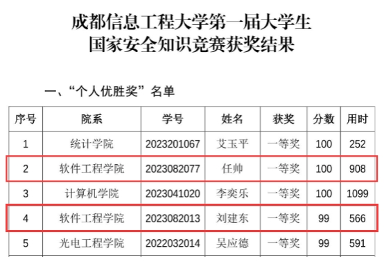 近日,学校第一届老员工国家安全知识网络竞赛活动落下帷幕,公司学子任帅、刘建东获得“个人优胜奖”一等奖,敬雨欣、官玉锋获得二等奖,李思雨、罗嘉豪、刘银、李天龙、陈锐获得三等奖,陈绍华荣获“优秀指导教师”,学院荣获“优秀组织奖”。