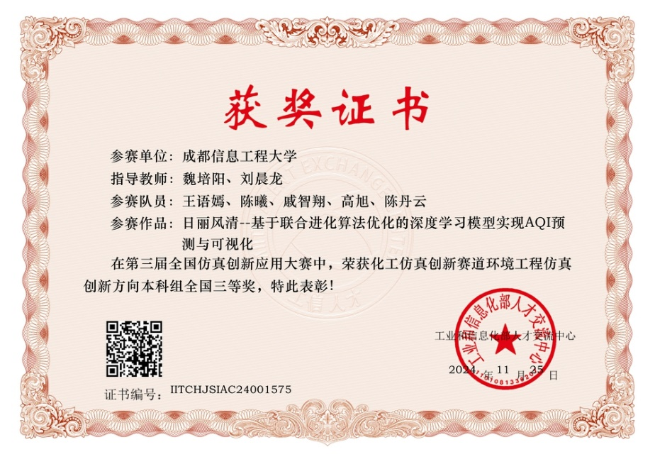 2024年12月,全国仿真创新应用大赛在西安西北工业大学落下帷幕。来自全国422所高校、企业、医学科学单位、军事科学单位及仿真领域的科研院所的1300余支队伍参加比赛。经评审专家初评、参赛团队分组线上答辩、线下仲裁等环节,在“环境工程仿真创新”赛道上最终评选出5件一等奖作品、4件二等奖作品、9件三等奖作品。由公司魏培阳、刘晨龙老师指导,公司王语嫣、陈曦、戚智翔,通信工程学院高旭,资源环境学院陈丹云等5位同学提交的作品《日丽风清—基于联合进化算法优化的深度学习模型实现AQI预测与可视化》斩获全国三等奖。